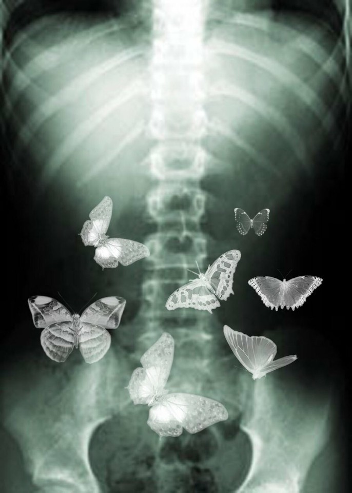 por motivo de desconfiança na minha saúde fiz um raio-x e descobri que o meu estômago foi invadido por borboletas. a minha esperança de morte tem os dias contados.